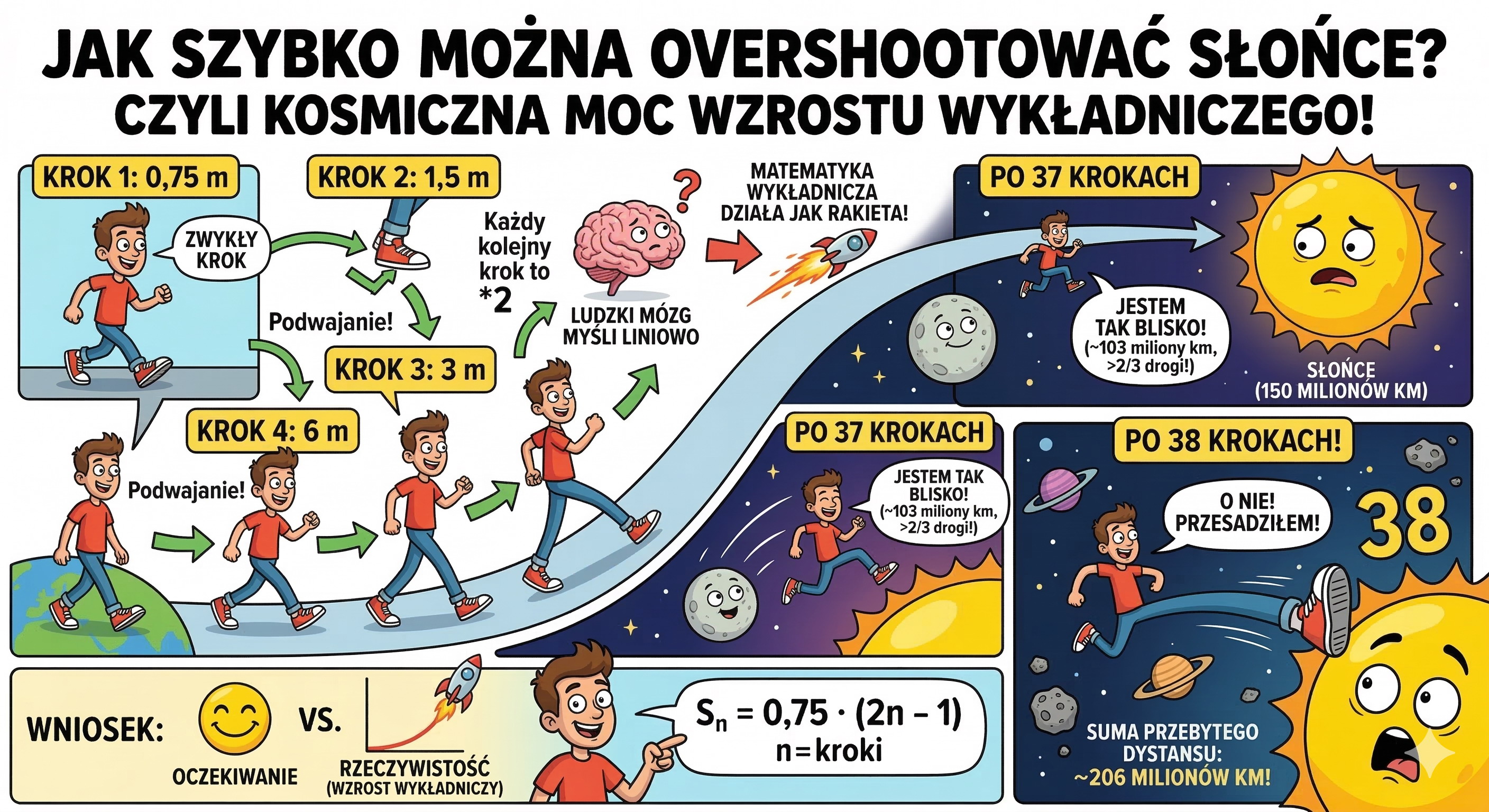 Rozwińmy te 38 kroków z Ziemi do Słońca. Jest to doskonały przykład tego, jak niewyobrażalnie szybko działa wzrost wykładniczy (w tym przypadku podwajanie kroku). Ludzki mózg jest przyzwyczajony do myślenia liniowego, dlatego wynik ten wydaje się wręcz niemożliwy, ale matematyka nie kłamie.